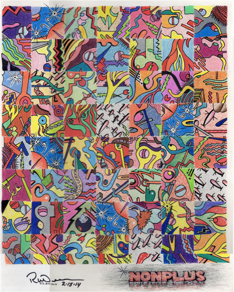 A grid of vibrant squares, each bursting with surreal symbols—eyes, arrows, stars, squiggles, faces, and forms that defy logic. It’s a mosaic of micro-worlds, stitched together in a riot of color and contradiction. The word NONPLUS anchors the bottom, bold and dimensional, like a title card for confusion itself.