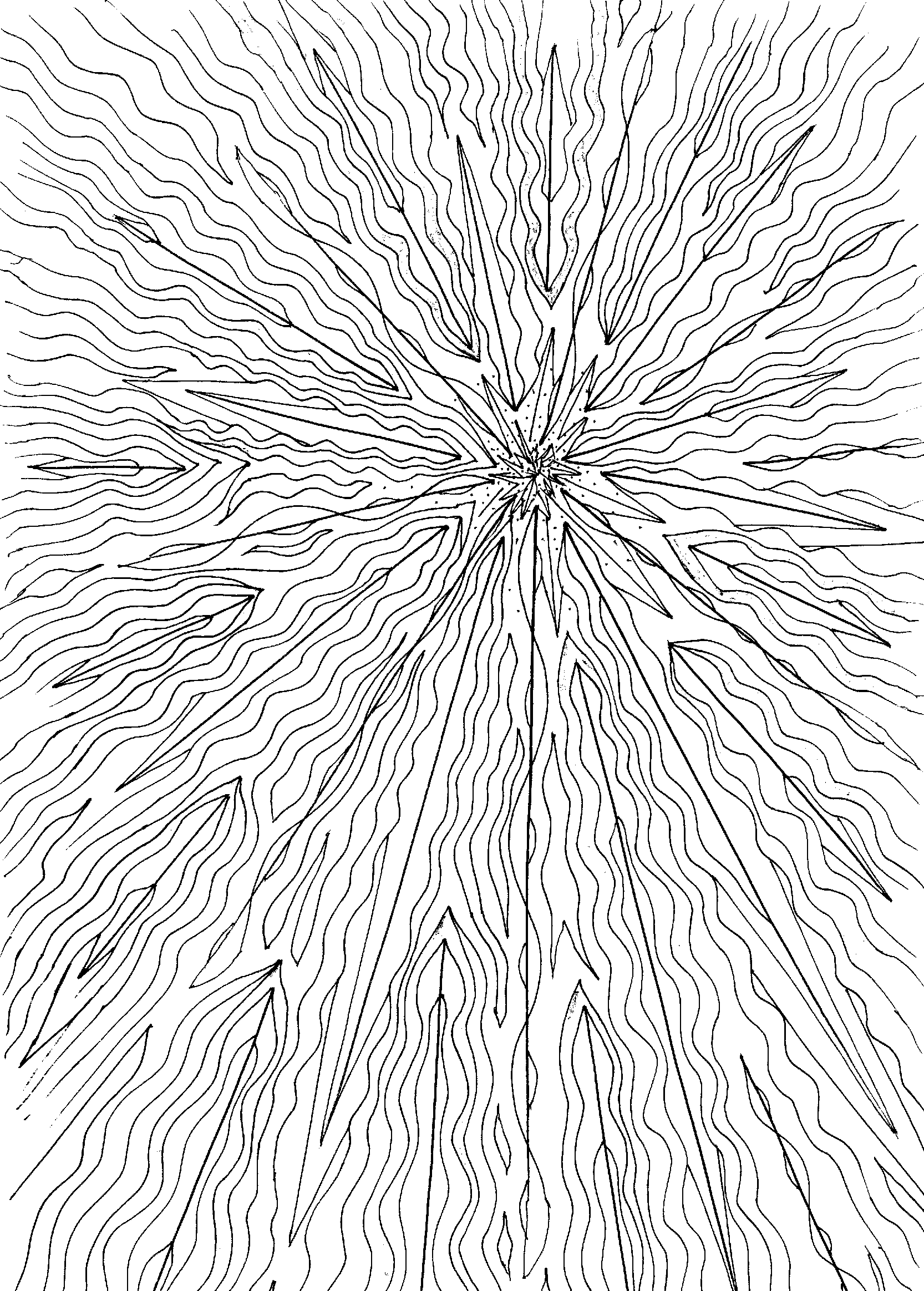 This piece breathes like a field in motion—curved arrows radiating from a central point, each one a whisper of force, a ripple of intent. The lines bend and stretch with organic grace, like wind caught in a moment of revelation. The center is dense, almost frantic, a birthplace of energy unraveling into space.
