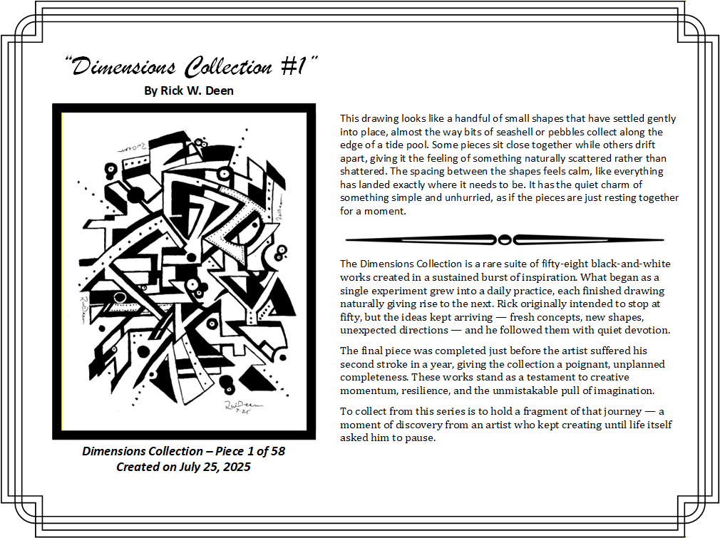 The certificate holder will include the artwork in a protective sleeve with a certificate of authenticity and the expanded narrative in this web page.