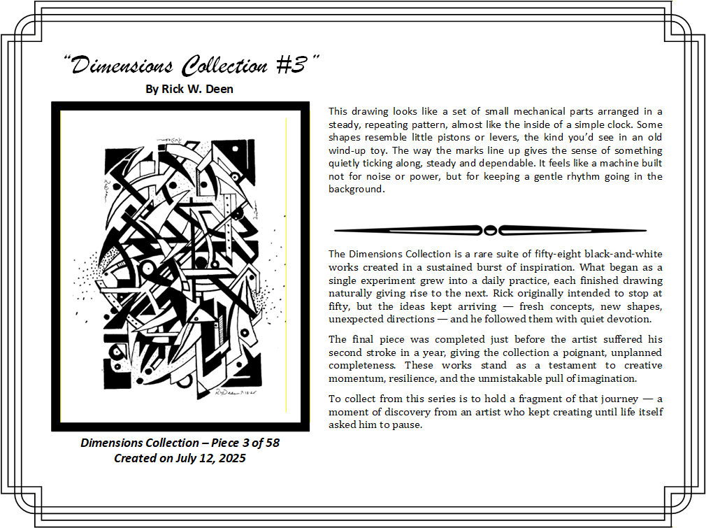 The certificate holder will include the artwork in a protective sleeve with a certificate of authenticity and the expanded narrative in this web page. This below is a sample of the first piece in the collection, but you will get the equivalent of the one you reserve.