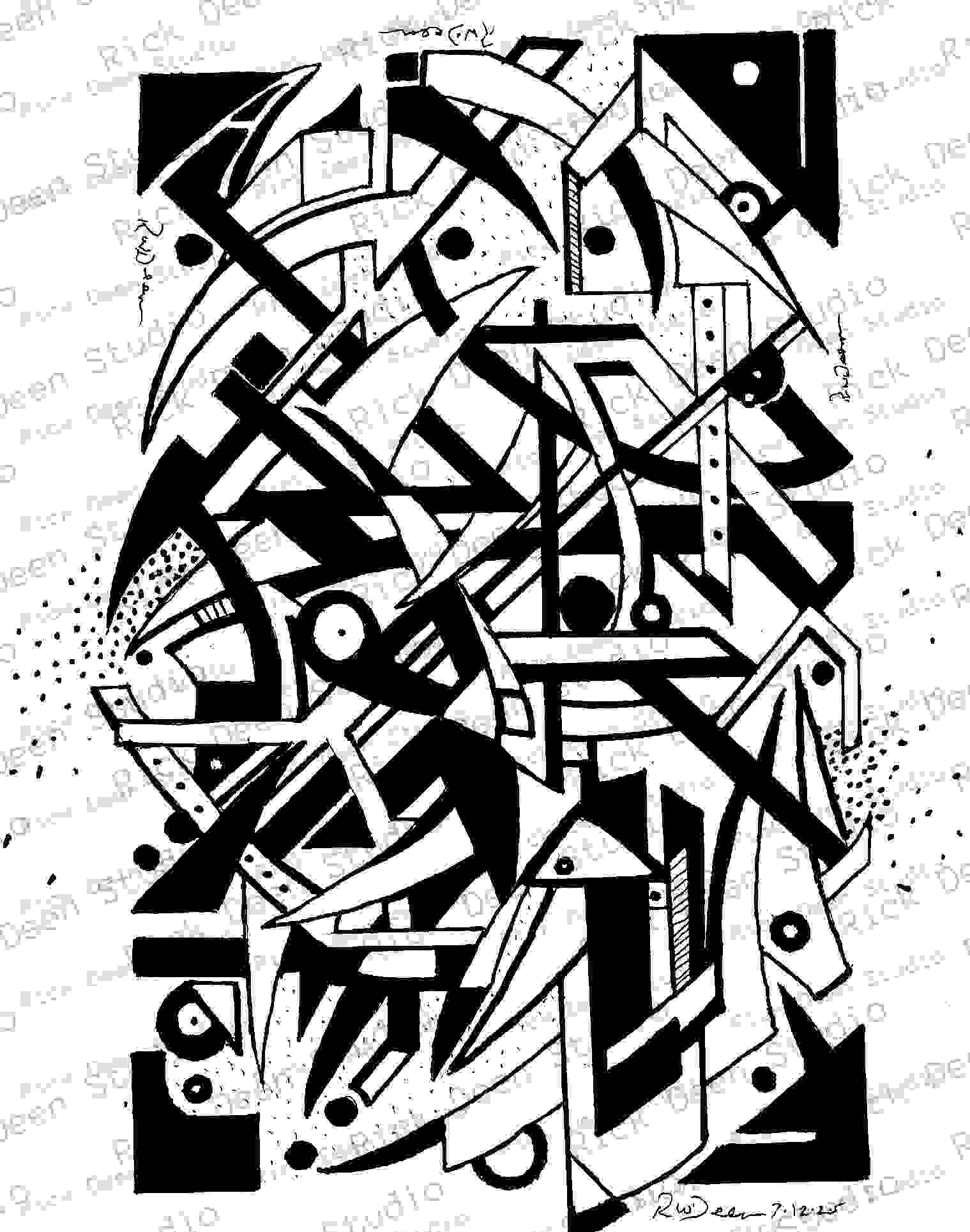 This drawing looks like a set of small mechanical parts arranged in a steady, repeating pattern, almost like the inside of a simple clock. Some shapes resemble little pistons or levers, the kind you’d see in an old wind‑up toy. The way the marks line up gives the sense of something quietly ticking along, steady and dependable. It feels like a machine built not for noise or power, but for keeping a gentle rhythm going in the background.