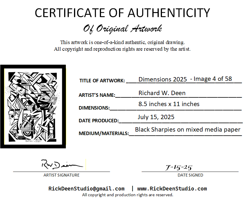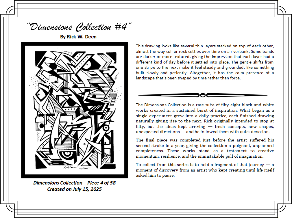 The certificate holder will include the artwork in a protective sleeve with a certificate of authenticity and the expanded narrative in this web page. This below is a sample of the first piece in the collection, but you will get the equivalent of the one you reserve.