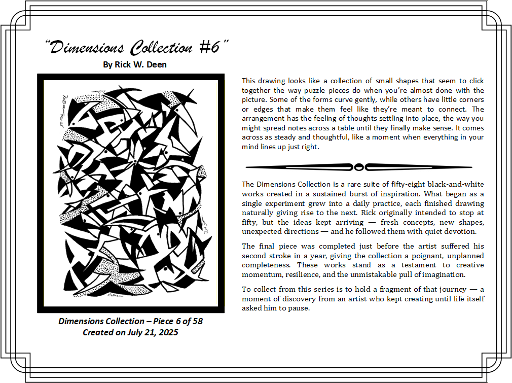 The certificate holder will include the artwork in a protective sleeve with a certificate of authenticity and the expanded narrative in this web page. This below is a sample of the first piece in the collection, but you will get the equivalent of the one you reserve.