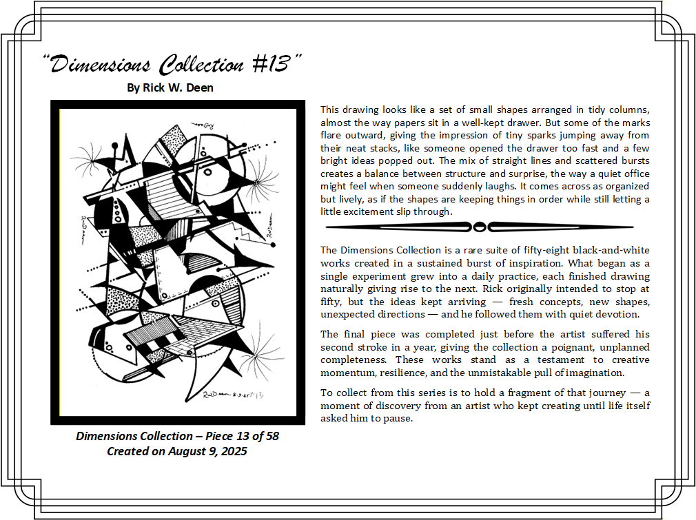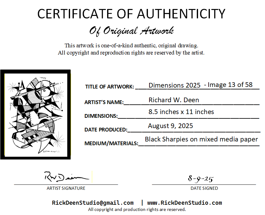 The certificate holder will include the artwork in a protective sleeve with a certificate of authenticity and the expanded narrative in this web page. This below is a sample of the first piece in the collection, but you will get the equivalent of the one you reserve.