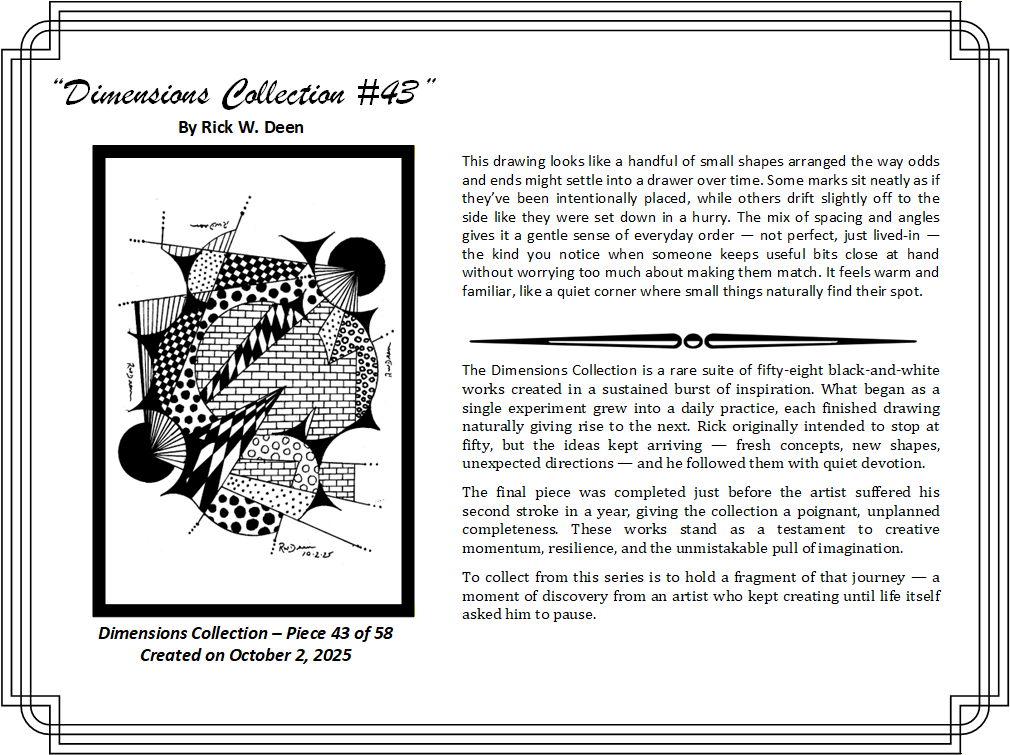 The certificate holder will include the artwork in a protective sleeve with a certificate of authenticity and the expanded narrative in this web page. This below is a sample of the first piece in the collection, but you will get the equivalent of the one you reserve.