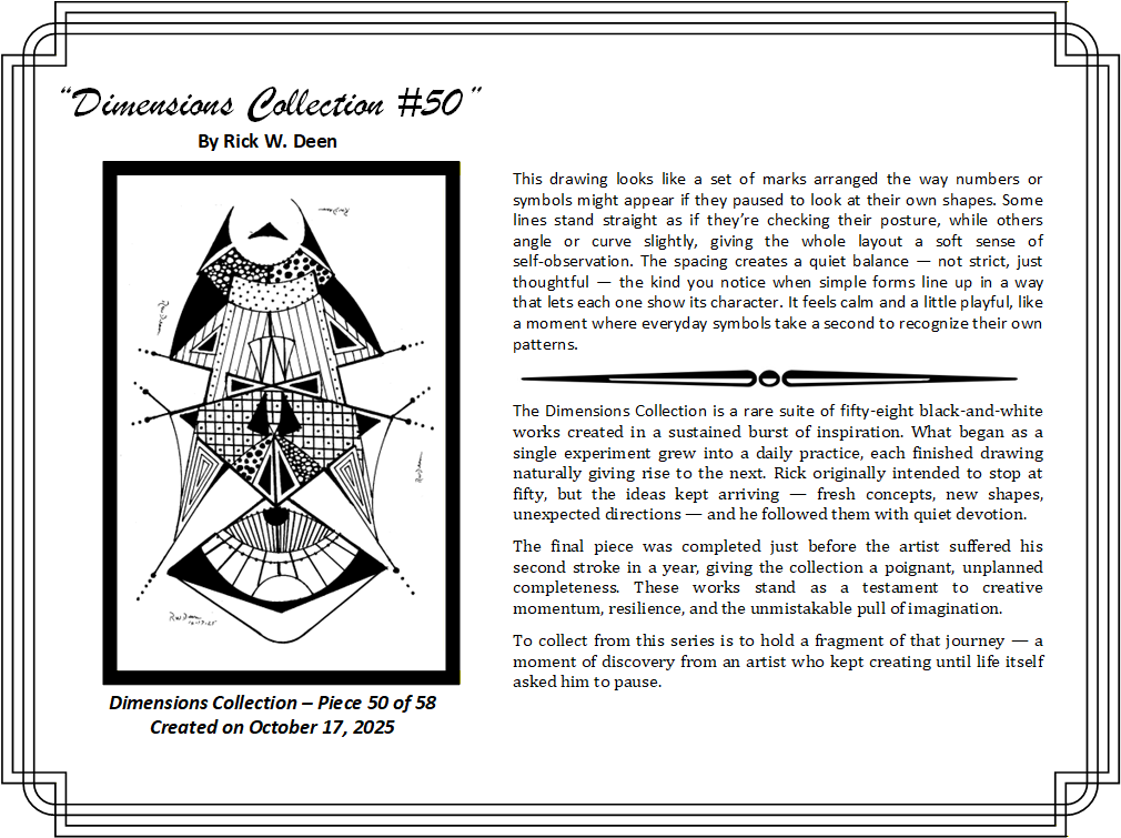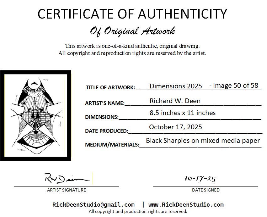 The certificate holder will include the artwork in a protective sleeve with a certificate of authenticity and the expanded narrative in this web page. This below is a sample of the first piece in the collection, but you will get the equivalent of the one you reserve.