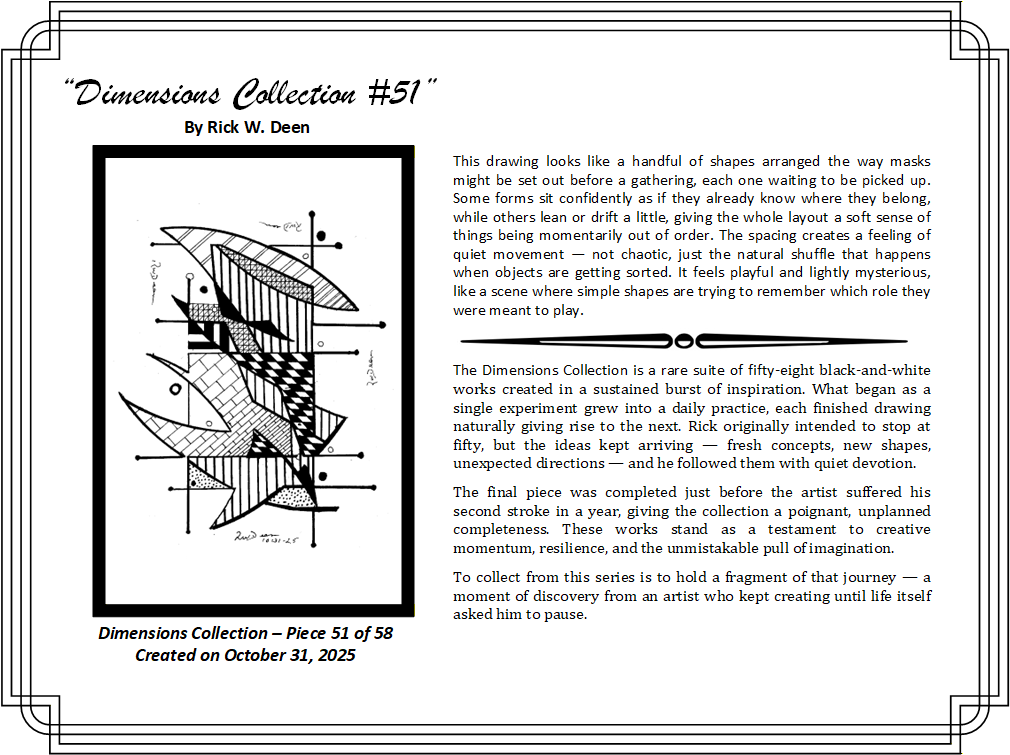 The certificate holder will include the artwork in a protective sleeve with a certificate of authenticity and the expanded narrative in this web page. This below is a sample of the first piece in the collection, but you will get the equivalent of the one you reserve.