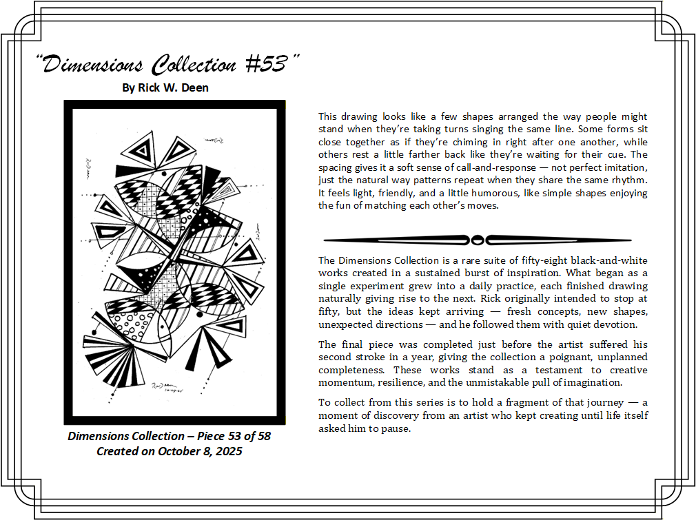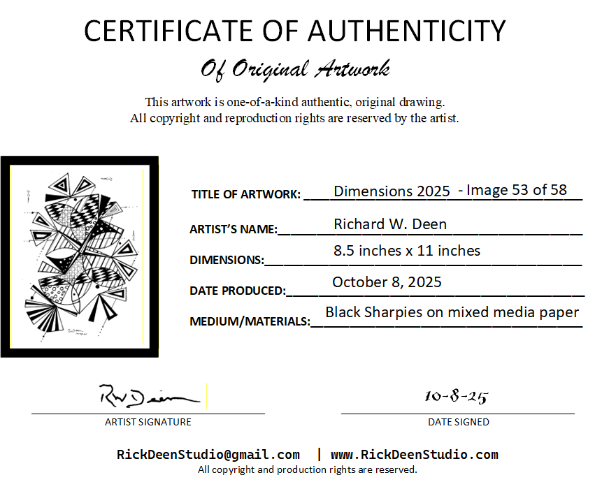 The certificate holder will include the artwork in a protective sleeve with a certificate of authenticity and the expanded narrative in this web page. This below is a sample of the first piece in the collection, but you will get the equivalent of the one you reserve.