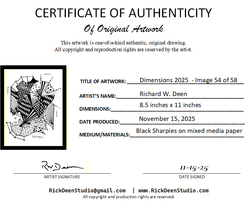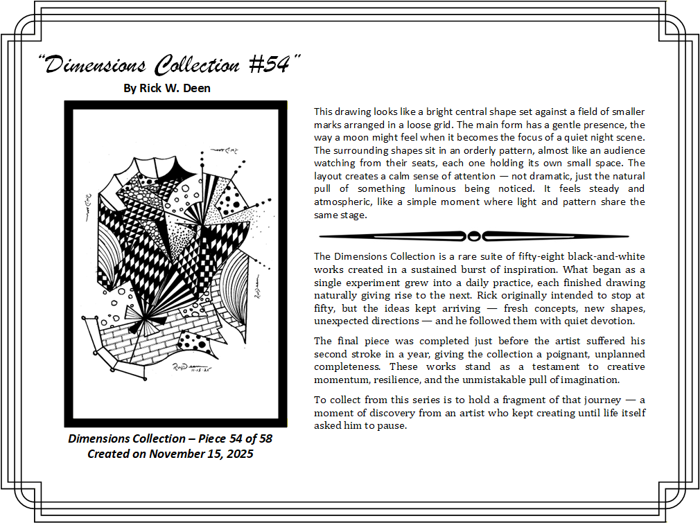 The certificate holder will include the artwork in a protective sleeve with a certificate of authenticity and the expanded narrative in this web page. This below is a sample of the first piece in the collection, but you will get the equivalent of the one you reserve.