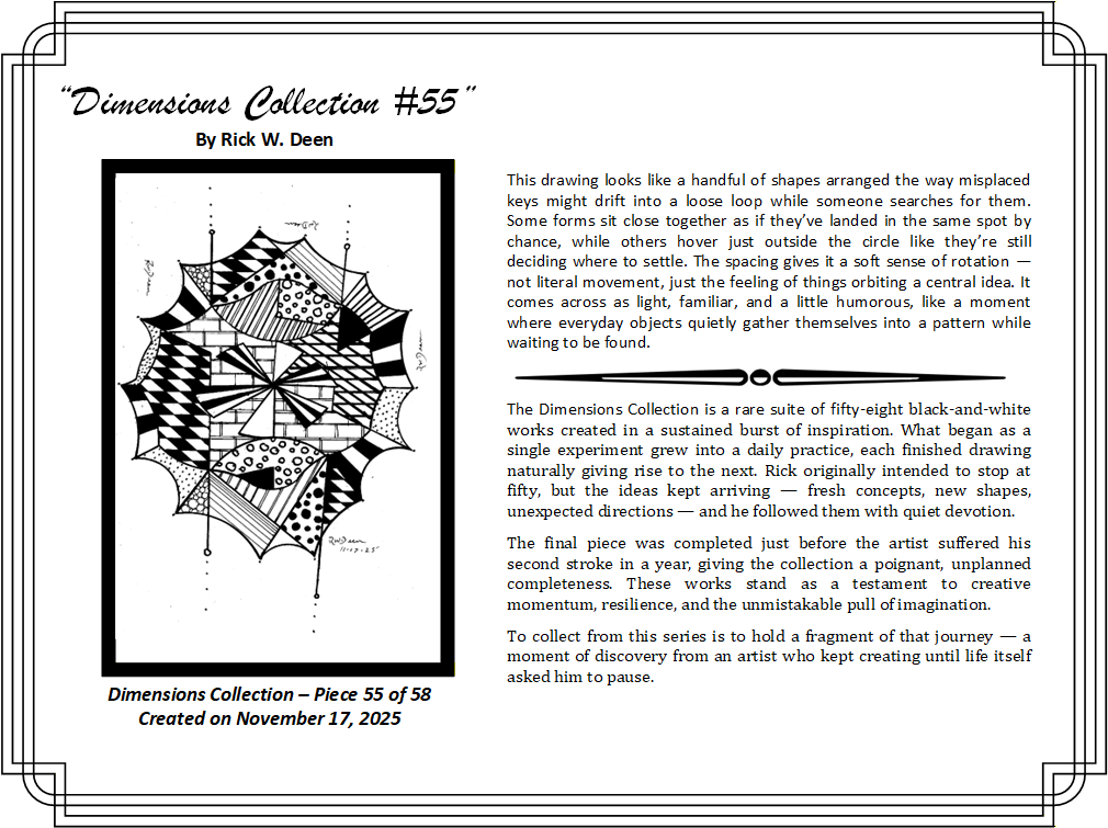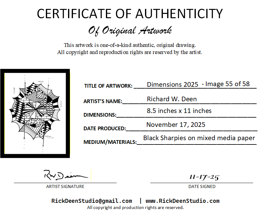 The certificate holder will include the artwork in a protective sleeve with a certificate of authenticity and the expanded narrative in this web page. This below is a sample of the first piece in the collection, but you will get the equivalent of the one you reserve.