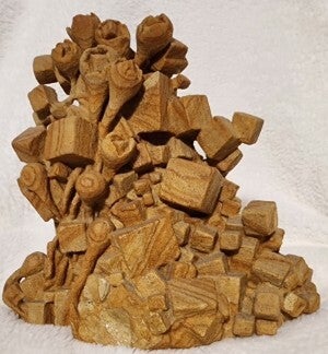 This sculpture is a collision of opposites—geometry and growth, architecture and bloom. Cubes and prisms jut outward like tectonic thoughts, while spiraling forms unfurl like rosebuds caught mid-breath. It’s a bouquet of contradiction: rigid and organic, deliberate and wild.